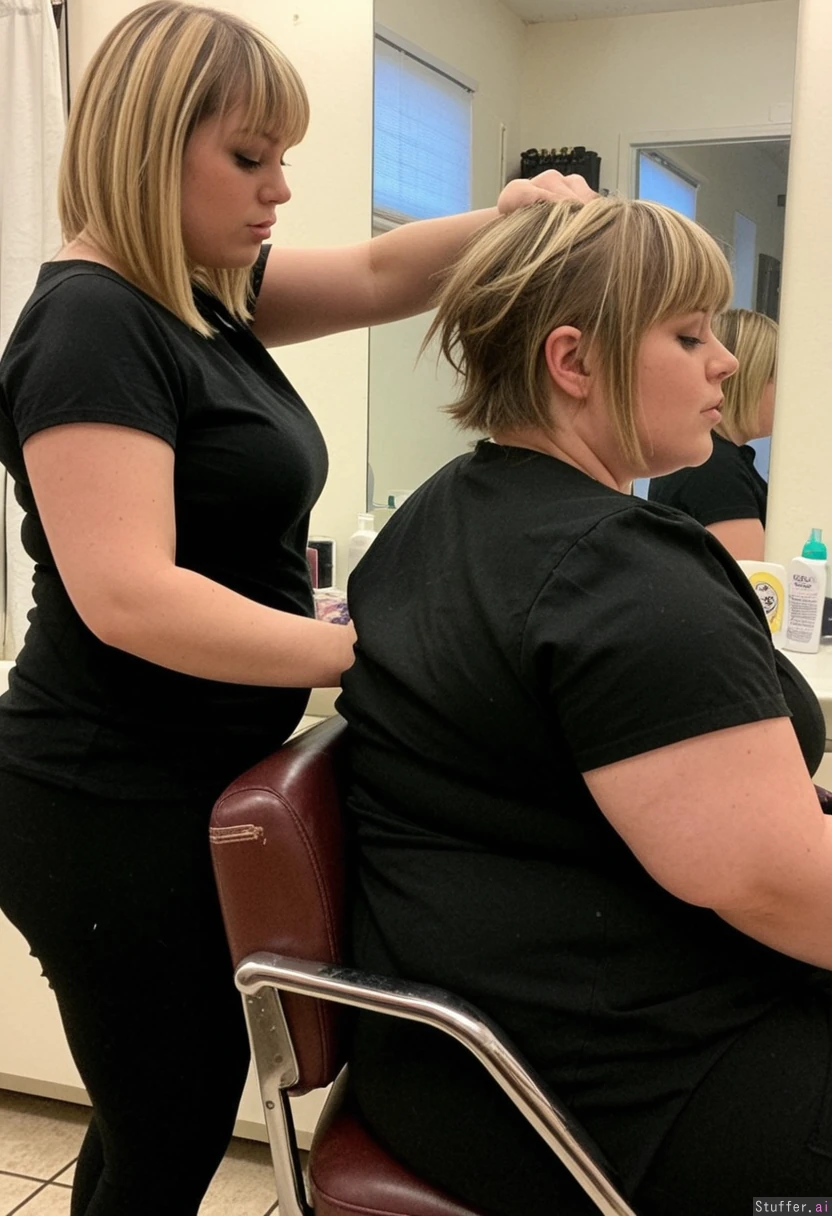 1) A panned out, profile view of a (petite-plus-size:1.8)(big_thighs:1.5) hairdresser (brunette, short hair, messy, bangs, black leggings, black t shirt) standing behind and cutting the hair of 2) a (cute:2.0)(fattened:1.6) chubby blonde (pastel dress) sitting in a barber's chair in a shabby-chic salon, (no text_on_clothing)