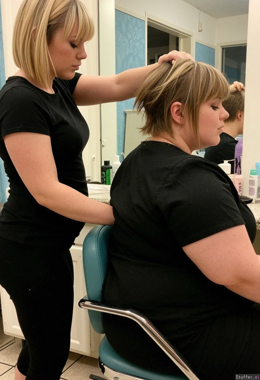 1) A panned out, profile view of a (petite-plus-size:1.8)(big_thighs:1.5) hairdresser (brunette, short hair, messy, bangs, black leggings, black t shirt) standing behind and cutting the hair of 2) a (cute:1.6)(fattened:1.6) chubby blonde (pastel dress) sitting in a barber's chair in a shabby-chic salon, (no text_on_clothing)