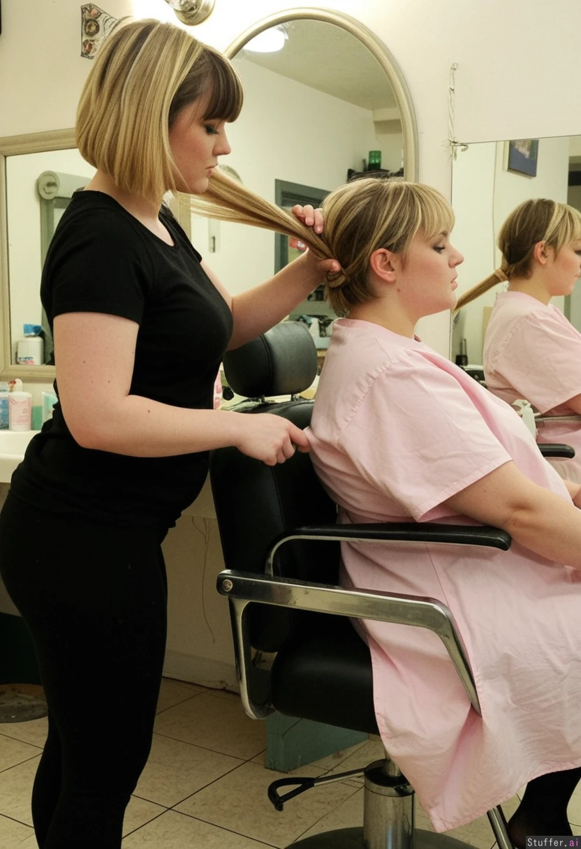 1) A panned out, profile view of a (Adorablychubby:1.4) hairdresser (brunette, short hair, messy, bangs, black leggings, black t shirt) standing behind and cutting the hair of 2) a chubby blonde (pastel dress) sitting in a barber's chair in a shabby-chic salon, (no text_on_clothing)