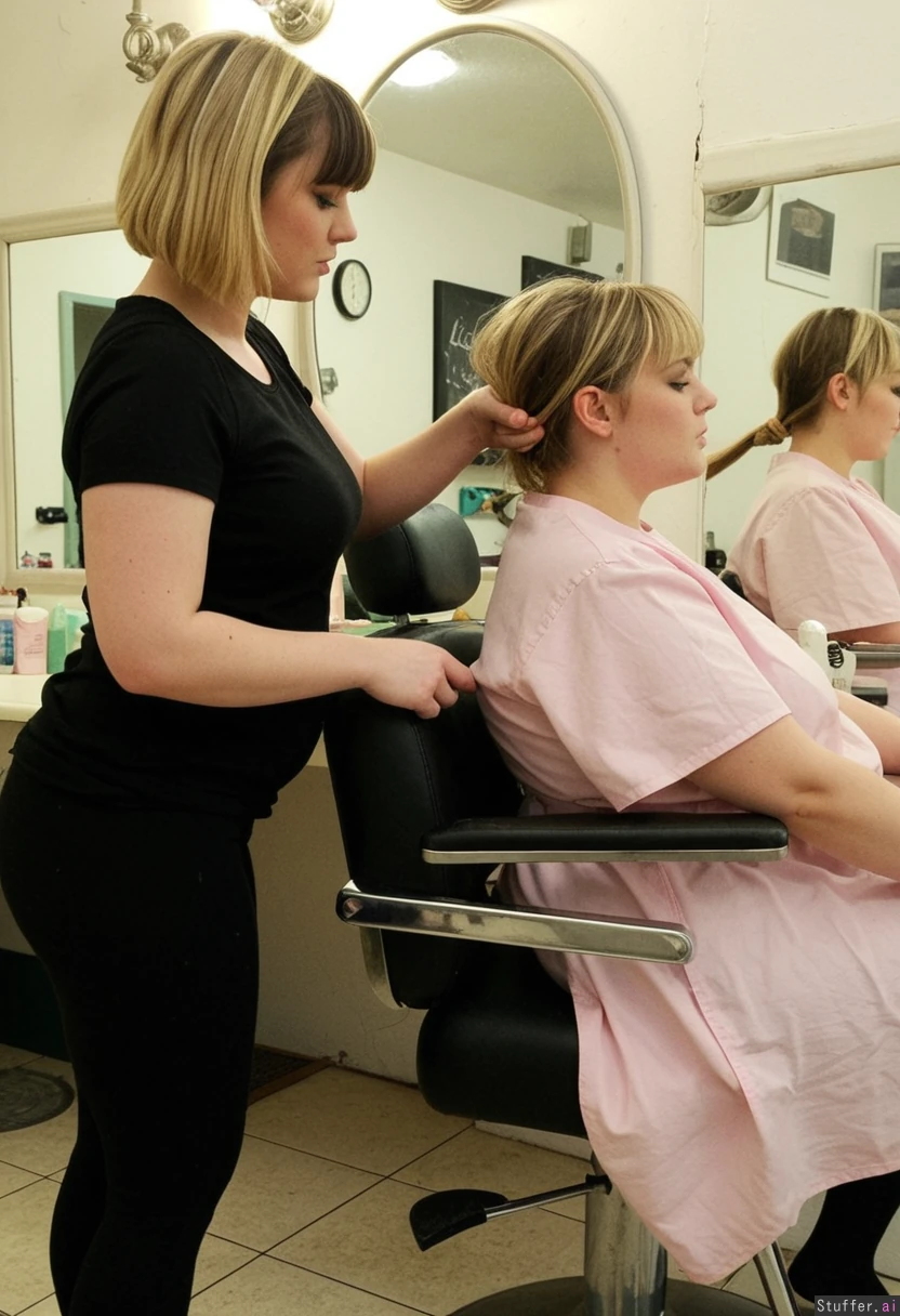 1) A panned out, profile view of a (Adorablychubby:1.6) hairdresser (brunette, short hair, messy, bangs, black leggings, black t shirt) standing behind and cutting the hair of 2) a chubby blonde (pastel dress) sitting in a barber's chair in a shabby-chic salon, (no text_on_clothing)
