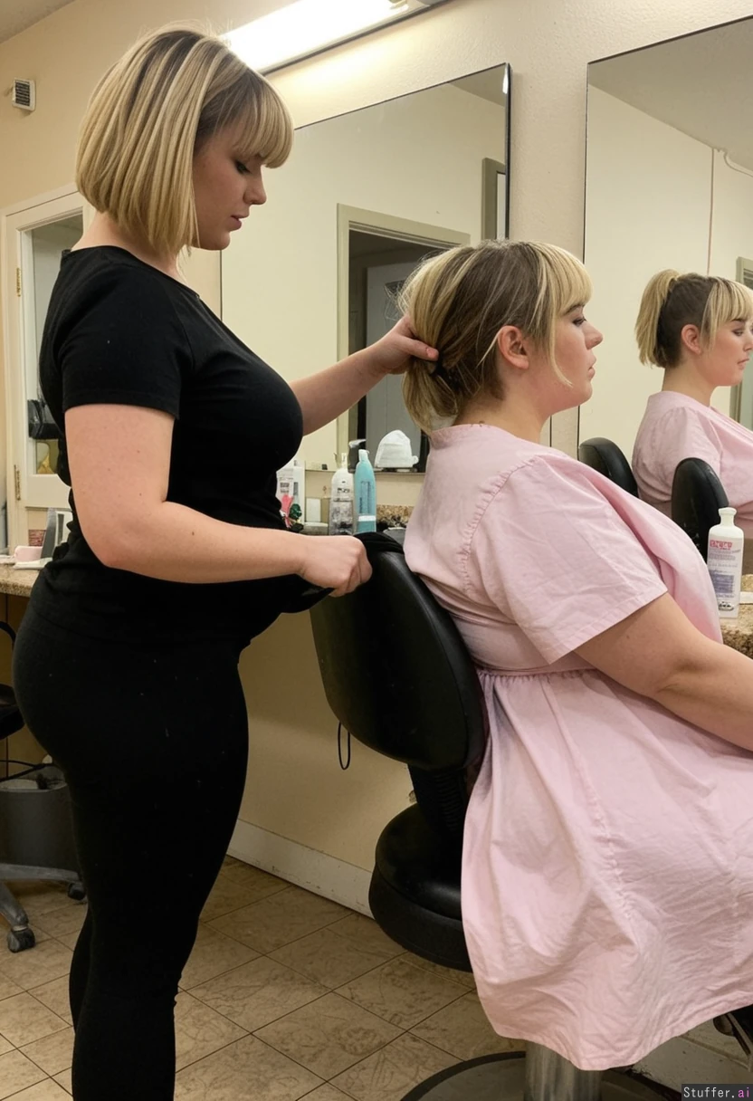 1) A panned out, profile view of a (enormous_tits:1.6)(bustygirl:1.6) hairdresser (brunette, short hair, messy, bangs, black leggings, black t shirt) standing behind and cutting the hair of 2) a (chubbygirl:1.6) blonde (pastel dress) sitting in a barber's chair in a shabby-chic salon, (no text_on_clothing)
