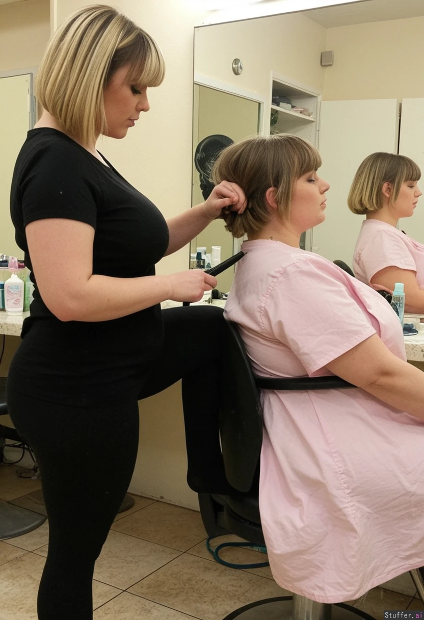 1) A panned out, profile view of a (enormous_tits:1.6)(bustygirl:1.6) hairdresser (brunette, short hair, messy, bangs, black leggings, black t shirt) standing behind and cutting the hair of 2) a (chubbycute:1.9) blonde (pastel dress) sitting in a barber's chair in a shabby-chic salon, (no text_on_clothing)