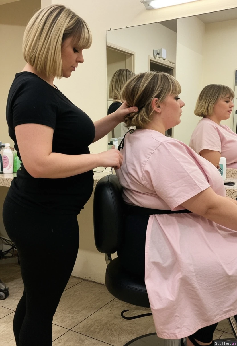 1) A panned out, profile view of a (enormous_tits:1.6)(fatassgirl:1.6) hairdresser (brunette, short hair, messy, bangs, black leggings, black t shirt) standing behind and cutting the hair of 2) a (chubbycute:1.9) blonde (pastel dress) sitting in a barber's chair in a shabby-chic salon, (no text_on_clothing)