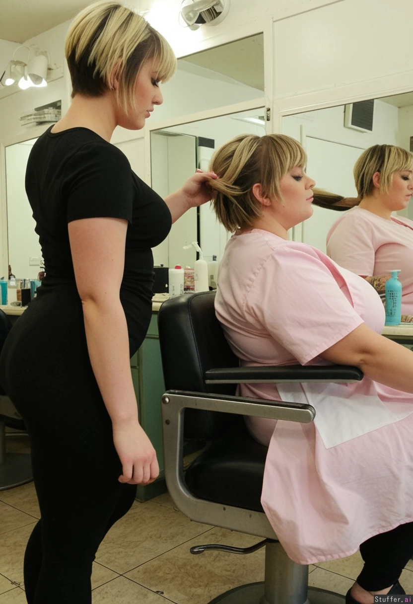 1) A panned out, profile view of a (voluptuous:1.6) hairdresser (brunette, short hair, messy, bangs, black leggings, black t shirt) standing behind and cutting the hair of 2) a (chubbycute:2.1) blonde (pastel dress) sitting in a barber's chair in a shabby-chic salon, (no text_on_clothing)