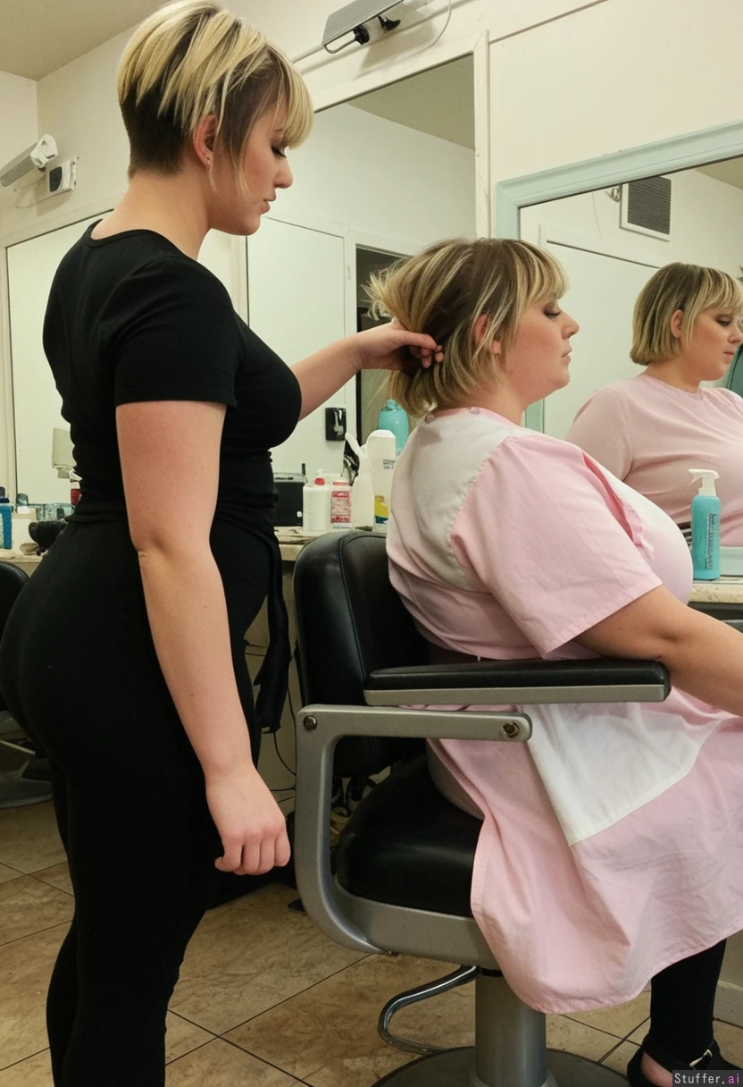 1) A panned out, profile view of a (voluptuous:1.9) hairdresser (brunette, short hair, messy, bangs, black leggings, black t shirt) standing behind and cutting the hair of 2) a (chubbycute:1.2) blonde (pastel dress) sitting in a barber's chair in a shabby-chic salon, (no text_on_clothing)