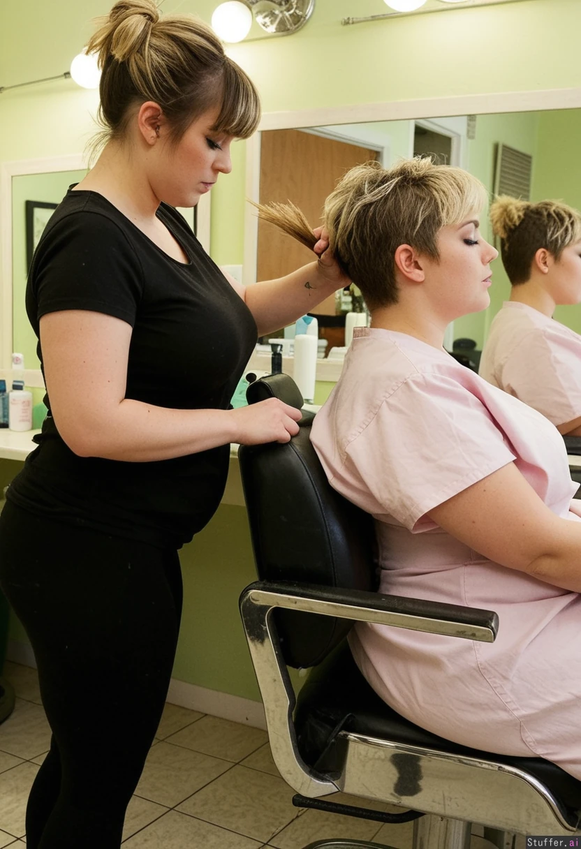 1) A panned out, profile view of a (voluptuous:2.1) hairdresser (brunette, short hair, messy, bangs, black leggings, black t shirt) standing behind and cutting the hair of 2) a plumped-up blonde girl (pastel dress) sitting in a barber's chair in a shabby-chic salon, (no text_on_clothing)