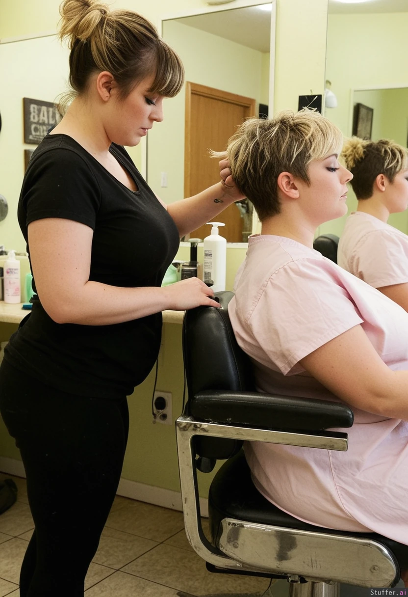 1) A panned out, profile view of a (voluptuous:2.4) hairdresser (brunette, short hair, messy, bangs, black leggings, black t shirt) standing behind and cutting the hair of 2) a plumped-up blonde girl (pastel dress) sitting in a barber's chair in a shabby-chic salon, (no text_on_clothing)