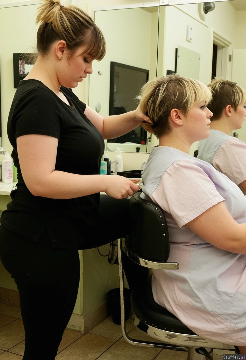 1) A panned out, profile view of a (voluptuous:2.4)(petitobese:1.5) hairdresser (brunette, short hair, messy, bangs, black leggings, black t shirt) standing behind and cutting the hair of 2) a plumped-up blonde girl (pastel dress) sitting in a barber's chair in a shabby-chic salon, (no text_on_clothing)