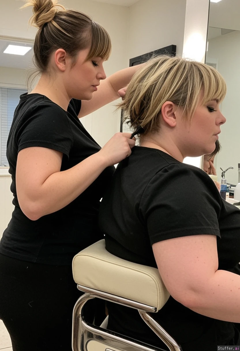 1) A panned out, profile view of a (voluptuous:2.4)(petitobese:1.8)(swollen:1.9)(overfed:1.9) hairdresser (brunette, short hair, messy, bangs, black leggings, black t shirt) standing behind and cutting the hair of 2) a plumped-up blonde girl (pastel dress) sitting in a barber's chair in a shabby-chic salon, (no text_on_clothing)