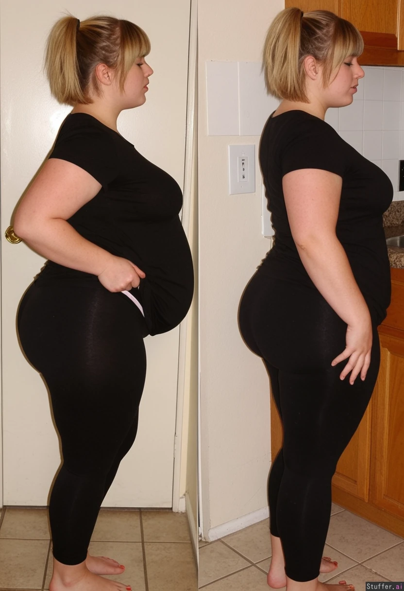1) A panned out, profile view of a (voluptuous:1.8)(petitobese:1.6)(swollen:1.9)(cute:1.9)(wide_hips:1.8) hairdresser (brunette, short hair, messy, bangs, black leggings, black t shirt) standing and 2) a plumped-up blonde girl (pastel dress) talking about how fat they've gotten in a kitchen (no text_on_clothing)