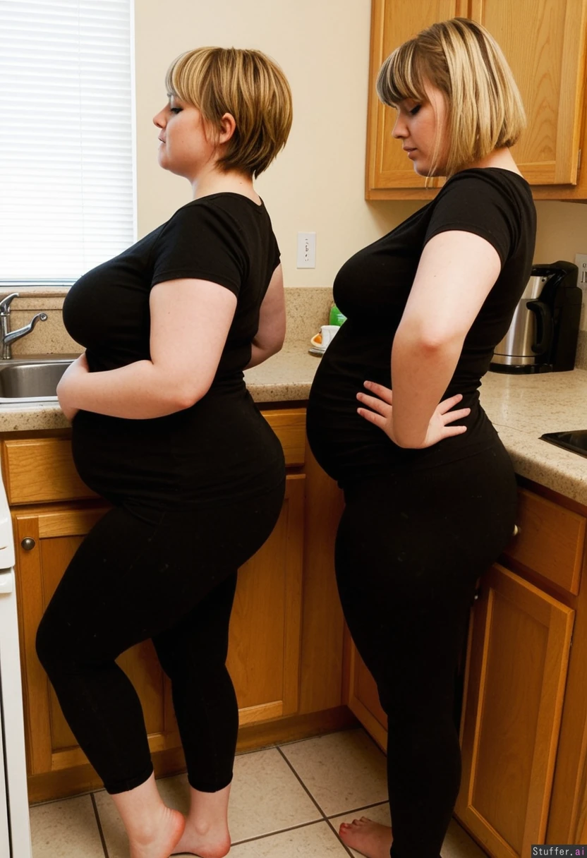 1) A panned out, profile view of a (voluptuous:1.8)(petitobese:1.6)(swollen:1.9)(cute:1.9)(wide_hips:1.8) hairdresser (brunette, short hair, messy, bangs, black leggings, black t shirt) standing and 2) a plumped-up blonde girl (pastel dress) showing off their bellies in a kitchen (no text_on_clothing)