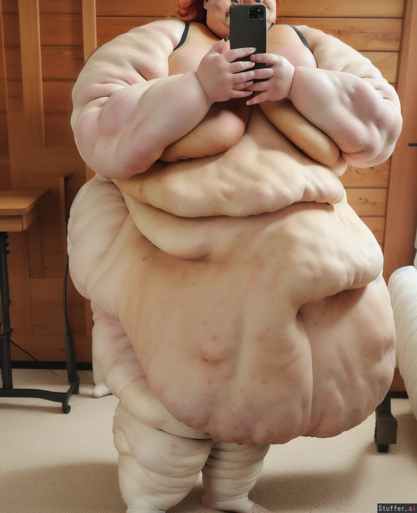 Photo realistic, ultra high quality, red head ssbbw, beautiful face:1.4, (ultra double chin:1.9), (ultra fat face:1.9), (ultra huge legs:1.9), (ultra huge arms:1.9), (ultra leg rolls:1.7), bare feet:1.4, naked:1.4, taking a selfie