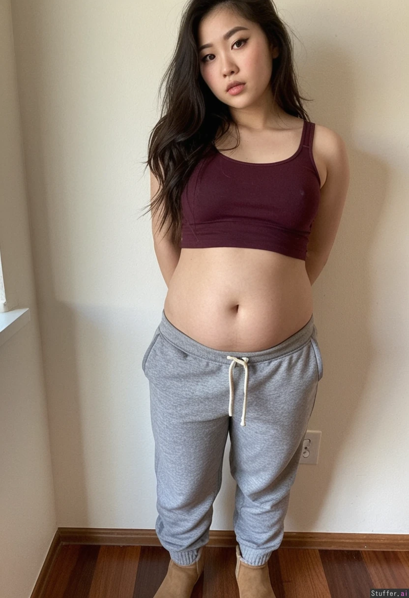 Korean woman with long dark messy hair, eyeliner, wearing tight burgundy string tank top, loose baggy grey sweatpants, light brown Ugg boots (((Thick lower belly)))