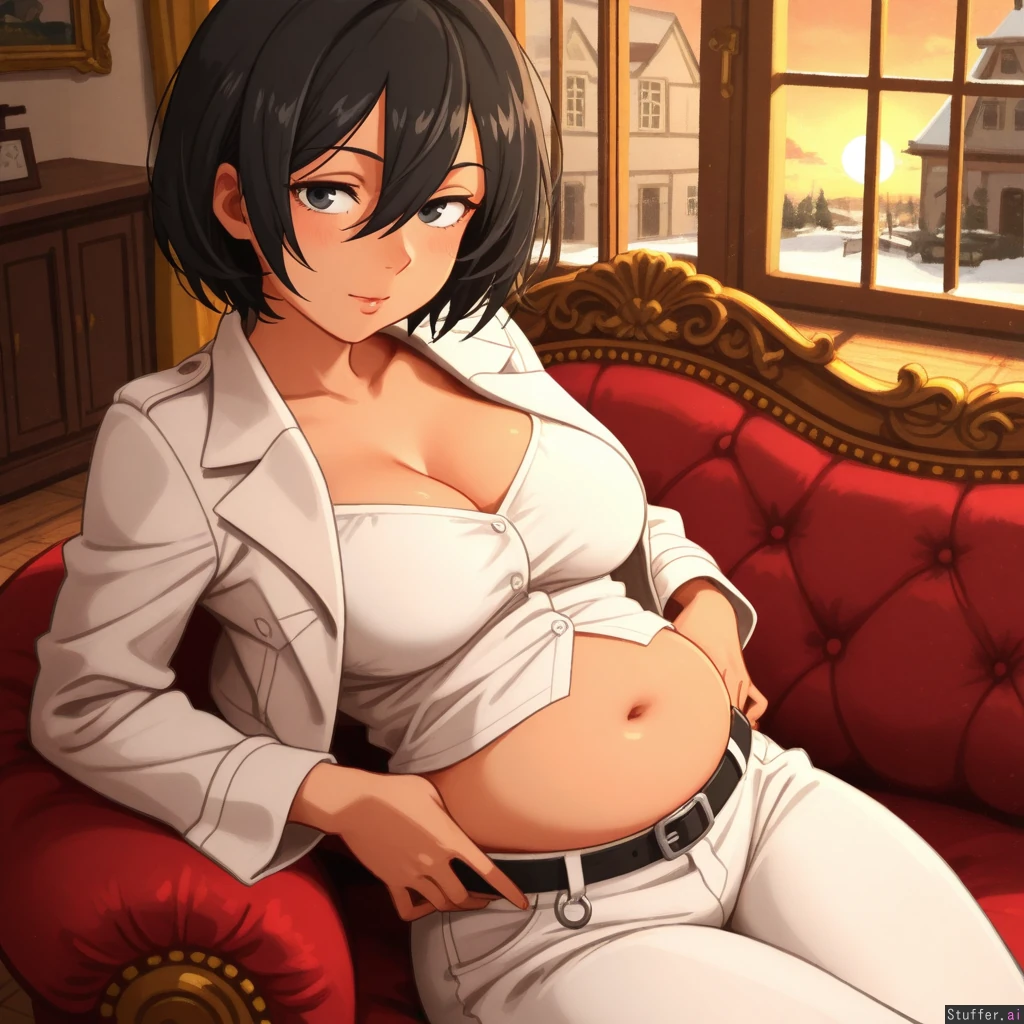 (highly detailed, best quality), (perfect anatomy, perfect proportions), (perfect lighting, warm lighting, vibrant colors, shadow, perfect shading), (beautiful face, beautiful eyes), (khyle.(artist)), snowy , sunset, golden hour lighting, winter , mansion , mikasa , full lips , grey eyes , black hair , mature face , top view , white pants , white blouse , tactical belt , odm gear , cropped leather jacket , cleavage, curvy , (potbelly, stuffed belly) , sitting in a large sofa , indoor , exquisite dining room , fire place , hands on belt