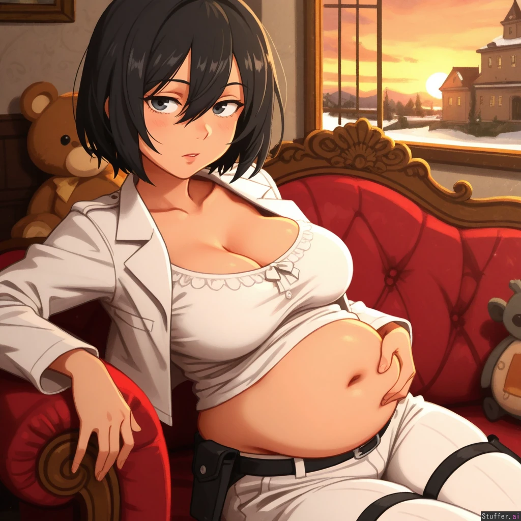 (highly detailed, best quality), (perfect anatomy, perfect proportions), (perfect lighting, warm lighting, vibrant colors, shadow, perfect shading), (beautiful face, beautiful eyes), (khyle.(artist)), snowy , sunset, golden hour lighting, winter , mansion , mikasa , full lips , grey eyes , black hair , mature face , top view , white pants , white blouse , tactical belt , odm gear , cropped leather jacket , cleavage, curvy, plump , (fat belly, potbelly, stuffed belly) , sitting in a large sofa , indoor , exquisite dining room , fire place , belly_grab