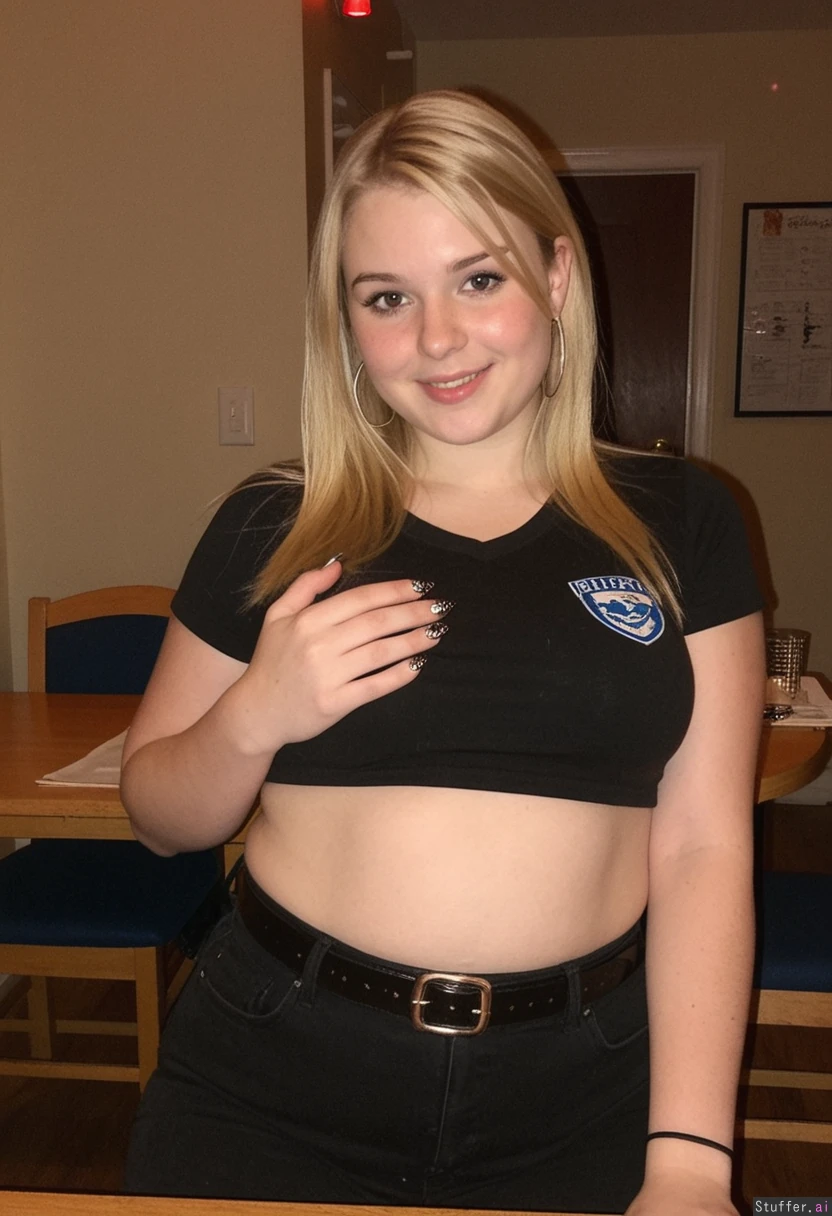 ((20 year old blonde college girl, pretty face, cute perfect face:1.8)), perfect teeth, photo with flash , College popular girl, blonde hair, hoop_earrings, (), very tight high waisted black jeans, shirt, restaurant, belt, sitting, girl next door, black tight shirt tucked in pants, stuffed chubby belly, long_nails, wide_hips, long_hair, bloated belly, jewelry, Standing Holding her stuffed round chubby belly All her fat is on her belly_bursting_out_of_clothes belly_bursting_out_of_clothes