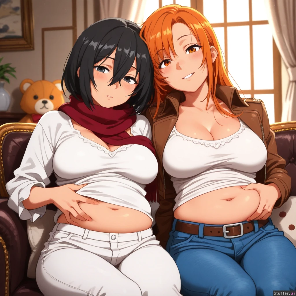 (highly detailed, best quality), (perfect anatomy, perfect proportions), (perfect lighting, warm lighting, vibrant colors, shadow, perfect shading), (beautiful face, beautiful eyes), (khyle.(artist)), (((2girls, Asuna and Mikasa))), snowy , sunset, golden hour lighting, winter , mansion , (mikasa , full lips , grey eyes , black hair , mature face , top view , white pants unzipped , white blouse , tactical belt unbuckled , odm gear , cropped leather jacket , Mikasa, cleavage, curvy, plump , (fat belly, potbelly, stuffed belly)), (Asuna, orange eyes, orange hair, mature face, flirty, White shirt tucked in, blue jeans, athletic body, slim) sitting in a large sofa , indoor , exquisite dining room , fire place , (((Asuna cuddling with Mikasa, Asuna grabbing belly, Asuna looking at belly)))