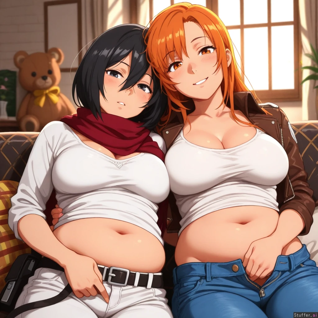(highly detailed, best quality), (perfect anatomy, perfect proportions), (perfect lighting, warm lighting, vibrant colors, shadow, perfect shading), (beautiful face, beautiful eyes), (khyle.(artist)), (((2girls, Asuna and Mikasa))), snowy , sunset, golden hour lighting, winter , mansion , (mikasa , full lips , grey eyes , black hair , mature face , top view , white pants unzipped , white blouse , tactical belt unbuckled , odm gear , cropped leather jacket , Mikasa, cleavage, curvy, plump , (fat belly, potbelly, stuffed belly)), (Asuna, orange eyes, orange hair, mature face, flirty, White shirt tucked in, blue jeans, athletic body, slim) Cuddling on a large sofa , indoor , exquisite dining room , fire place , (( cuddling_handjob ))