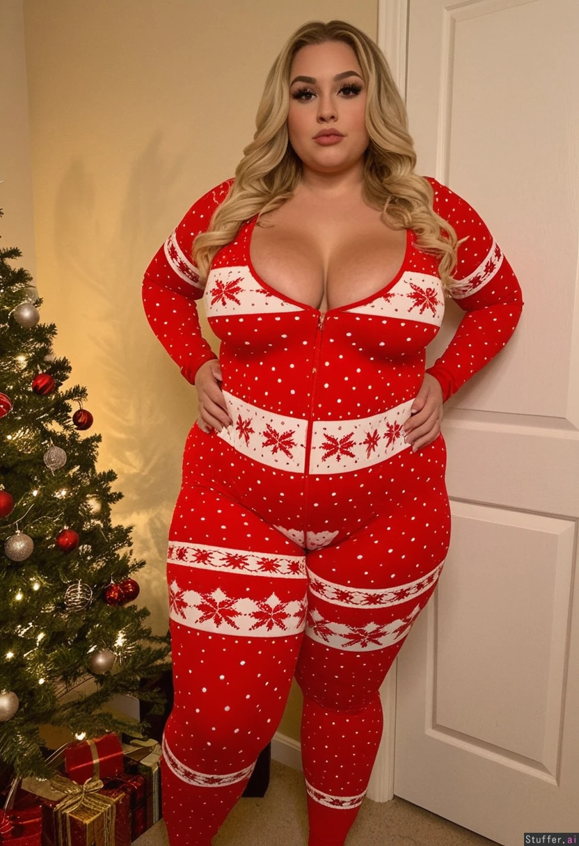 prefect beautiful 20 y o blonde wearing skin tight red christmas norwegian print onesie, sexy, thick. full wide hips and thighs, curled hair, heavy sexy makeup, emo eyeliner, very tan. lip filler, strong cheek bones, full cheeks, fat full cleavage full body view, standing, warm lighting, photo shoot realistic photo (bigger fatter lethargic voluptuous thighs: 1.2) (fatter wider lethargic voluptuous hip dips: 1.1)