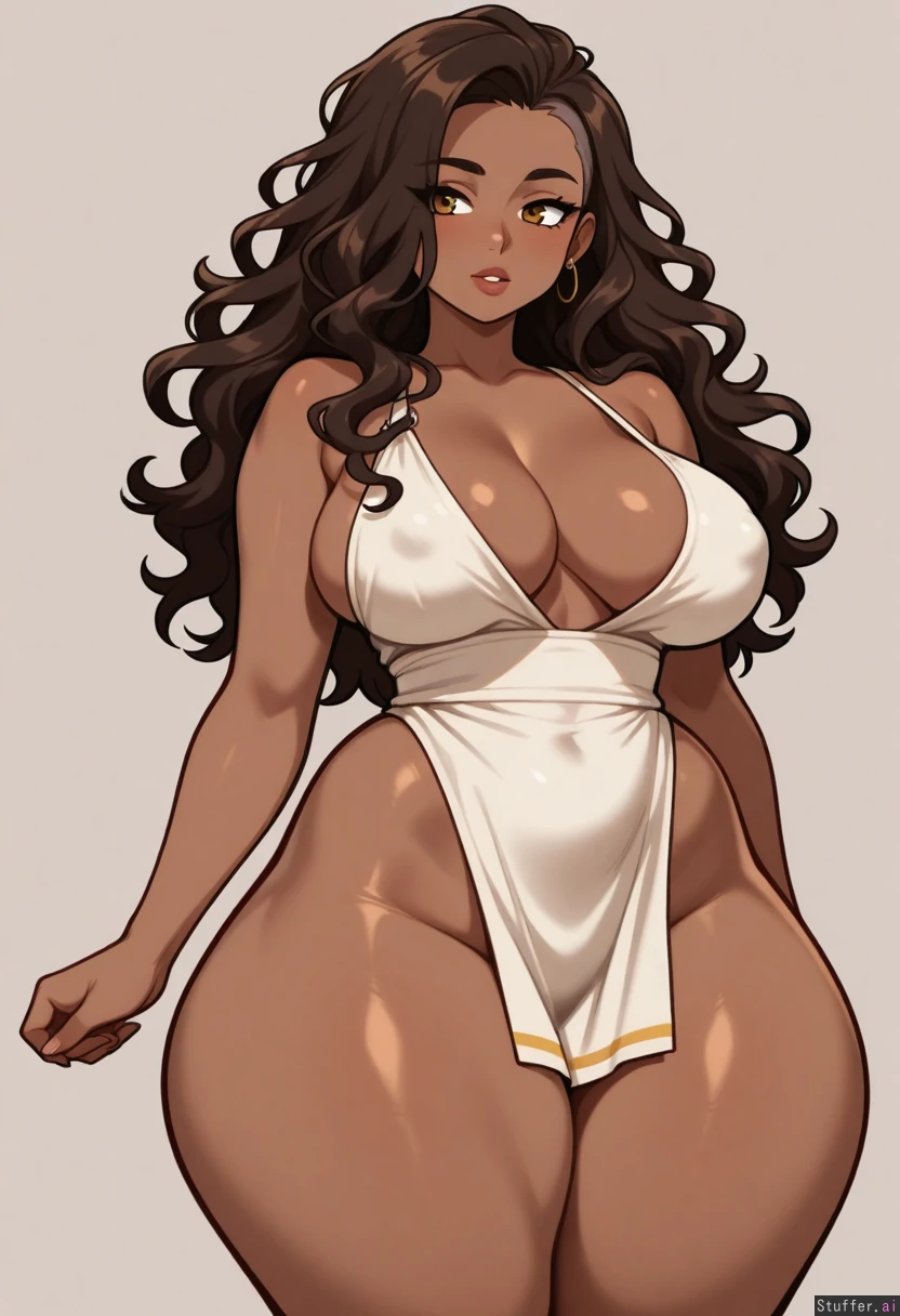 (( 1girl, solo, bushyspicy (artist) )) (( Brown_skin, sidecut, wavy_hair, long_hair)) (( thick_thighs:1.5)) (( Large_breasts:1.45))