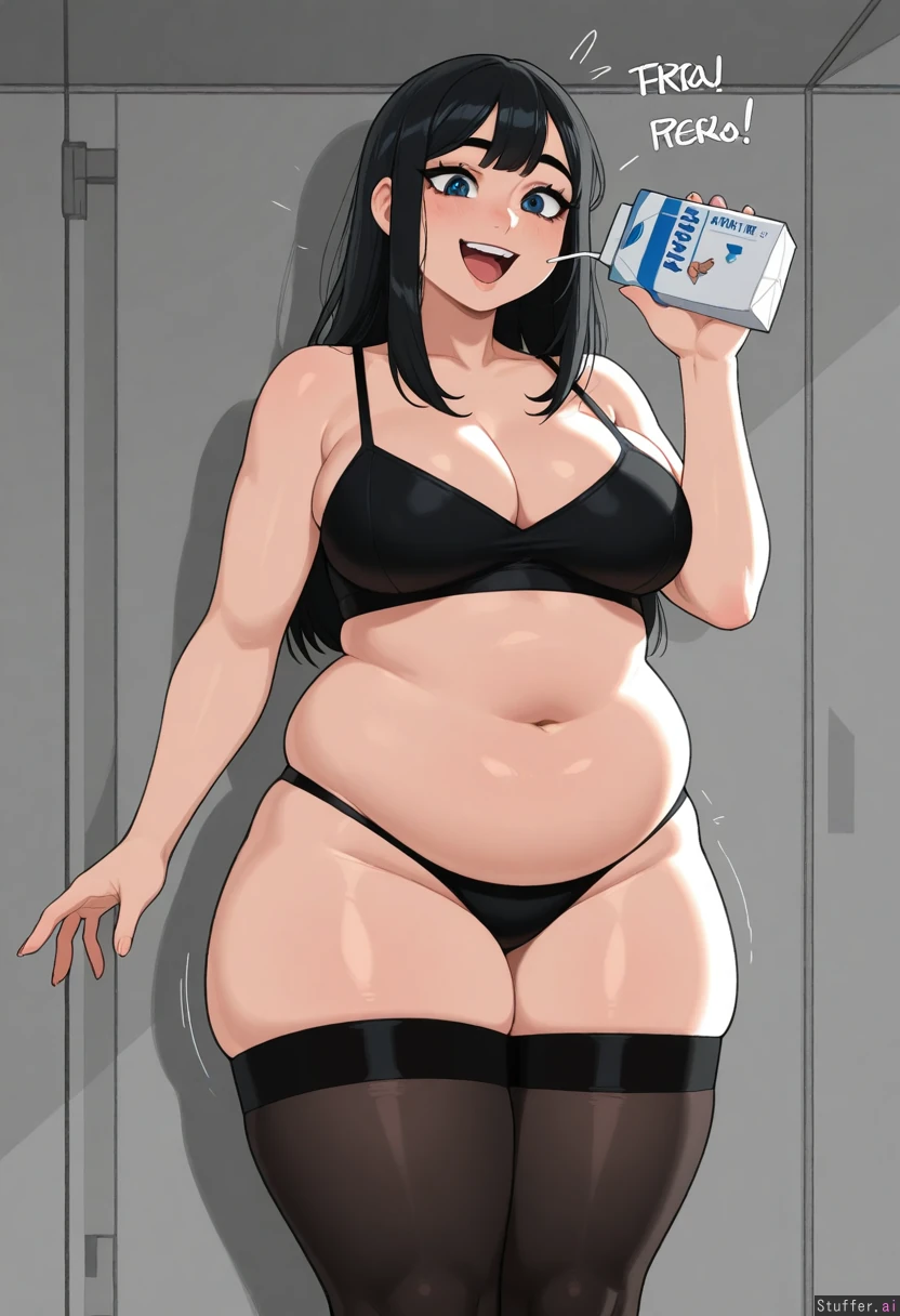 Shenyai(artist), krekkov(artists), KAMII MOMORU(artist), beautiful shading, highly detailed, best quality, perfect anatomy, perfect proportions, perfect lighting, Solo, adult, ((Black hair)), blue eyes, mascara, White bralette , black panties, black thigh highs, Standing, streamer, Happy, excited, (Skinny: .5) (Bubble butt: .5) (Chubby belly: 1.3) (Bloated belly: 1.0) Drinking milk_carton