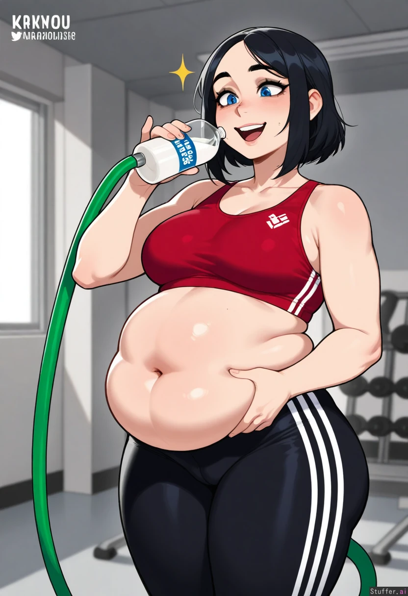 Shenyai(artist), krekkov(artists), KAMII MOMORU(artist), beautiful shading, highly detailed, best quality, perfect anatomy, perfect proportions, perfect lighting, Solo, adult, ((Black hair)), blue eyes, mascara, Red sports bra , black leggings, , At gym , streamer, Happy, excited, (Skinny: .5) (Bubble butt: .5) (Chubby belly: 1.5) (Bloated belly: 1.2) Drinking milk from a garden hose