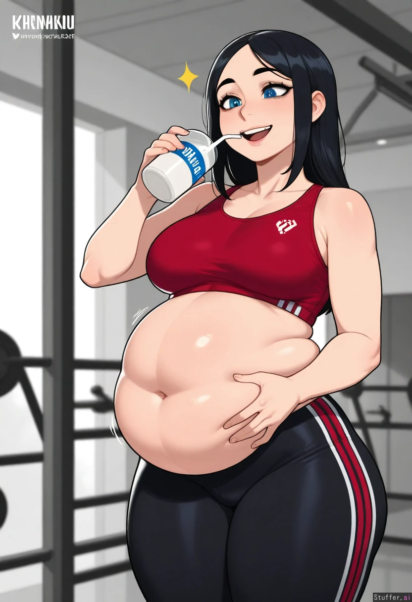 Shenyai(artist), krekkov(artists), KAMII MOMORU(artist), beautiful shading, highly detailed, best quality, perfect anatomy, perfect proportions, perfect lighting, Solo, adult, ((Black hair)), blue eyes, mascara, Red sports bra , tight black leggings, , At gym , streamer, Happy, excited, (Skinny: .5) (Bubble butt: .5) (Chubby belly: 1.5) (Bloated belly: 1.2) Drinking milk