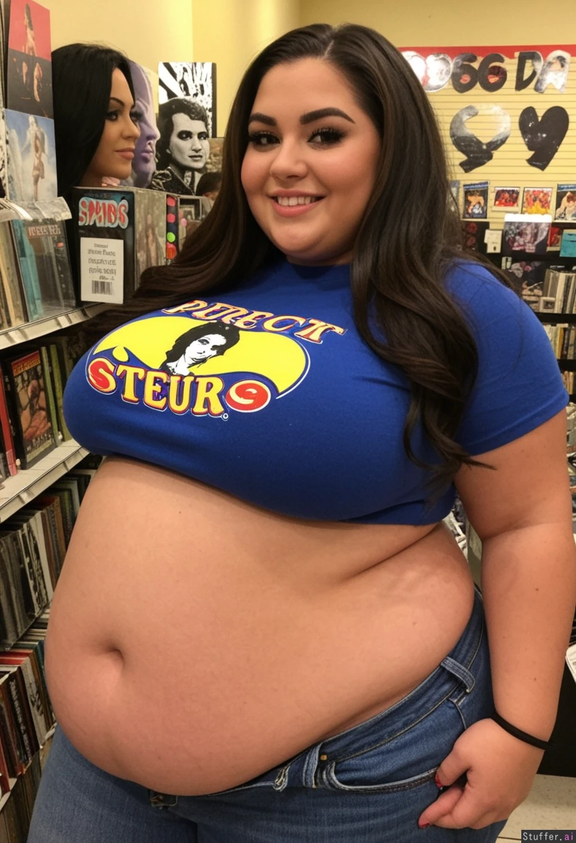 Chicana supermodel, masterpiece, perfect face, eyelashes, thick eyebrows, jeans, band Tshirt, seductive , record store , perky, smiling_at_viewer , long hair , (extremely wide hips: 1.3) bbw , tan_skin