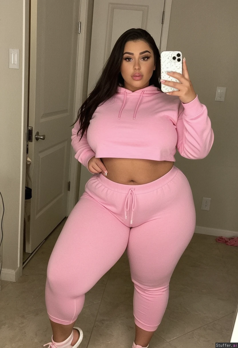 Style: selfie Subject: 21 year old, latina girl. Face: Very beautiful, gorgeous face, grey eyes, eyelashes, lip gloss, smooth skin. Hair: Dark hair, straight hairstyle, medium length. Body: (Chubby belly: 1), (thick thighs: 1.5), stiletto nails Clothes: (She's wearing tight pink cropped hoodie and pijama pants) Action: Posing Localisation: In house.