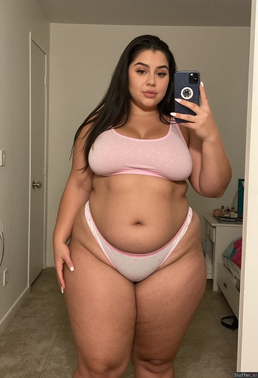 Style: selfie Subject: 21 year old, latina girl. Face: Very beautiful, gorgeous face, grey eyes, eyelashes, lip gloss, smooth skin. Hair: Dark hair, straight hairstyle, medium length. Body: (Chubby belly: 1.3), (thick thighs: 1.7), stiletto nails Clothes: (She's wearing tight pijamas) Action: Posing Localisation: In house.