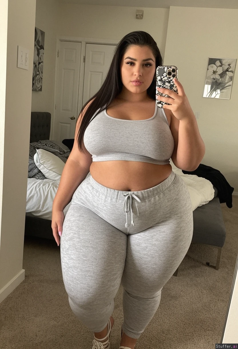 Style: selfie Subject: 21 year old, latina girl. Face: Very beautiful, gorgeous face, grey eyes, eyelashes, lip gloss, smooth skin. Hair: Dark hair, straight hairstyle, medium length. Body: (Chubby belly: 1), (thick thighs: 1.5), stiletto nails Clothes: (She's wearing tight top and pijama pants) Action: Posing with bf Localisation: In house.