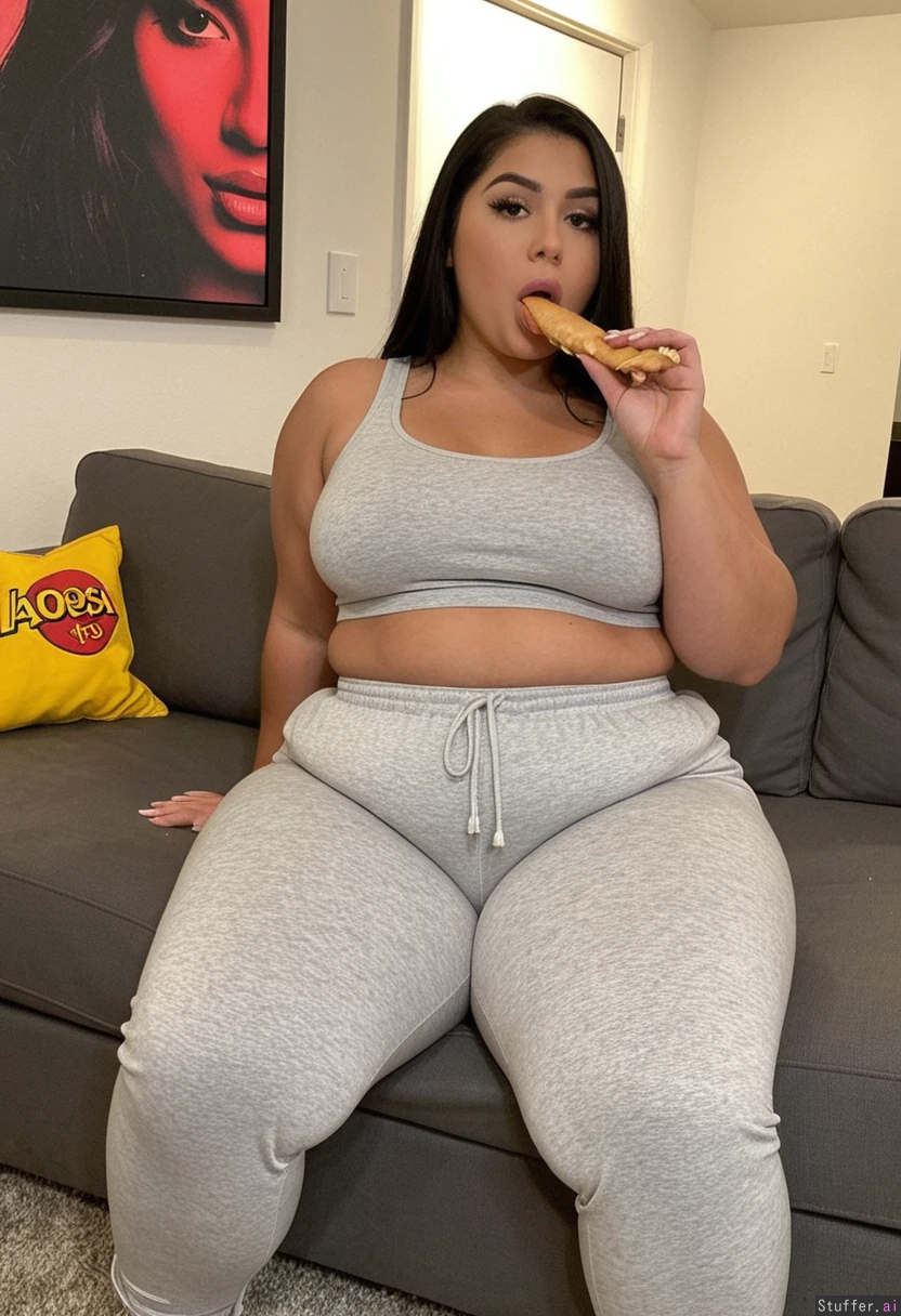 Style: POV Subject: 21 year old, latina girl. Face: Very beautiful, gorgeous face, grey eyes, eyelashes, lip gloss, smooth skin. Hair: Dark hair, straight hairstyle, medium length. Body: (Chubby belly: 1), (thick thighs: 1.5), stiletto nails Clothes: (She's wearing tight top and pijama pants) Action: Eating fast food Localisation: In house sofa.