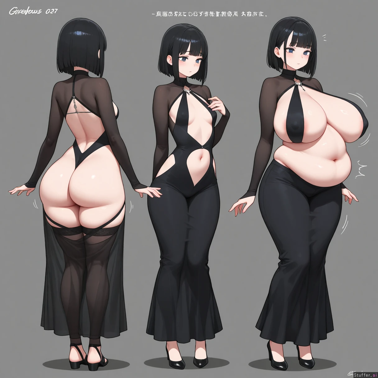 Gorgeous goth girl, short black hair, hair bob, small_boobs, flatchest, revealing_clothes, ((full body image)), breast expansion, going from small boobs to huge boobs, weight gain, belly expansion, going from skinny to fat, big round ass,