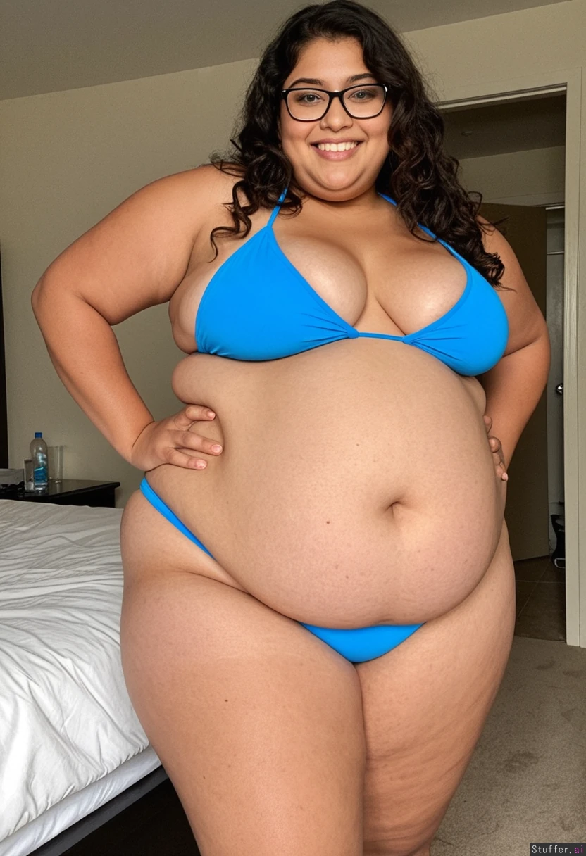 25 year old Indian woman, beautiful, smiling,bikini, glasses, standing in a bedroom, curvy , wavy hair