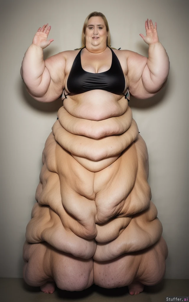 Photo realistic, highly detailed, realistic lighting, blonde ssbbw, standing, beautiful face, (wearing a black bikini:1.4) , (ultra double chin:1.8), (ultra fat face:1.8), ultra huge arms:1.9), (ultra huge legs:1.9), (ultra leg rolls:1.7), (ultra huge calves:1.8), (cellulite:1.5), ultra fat ankles:1.8), bare feet:1.4