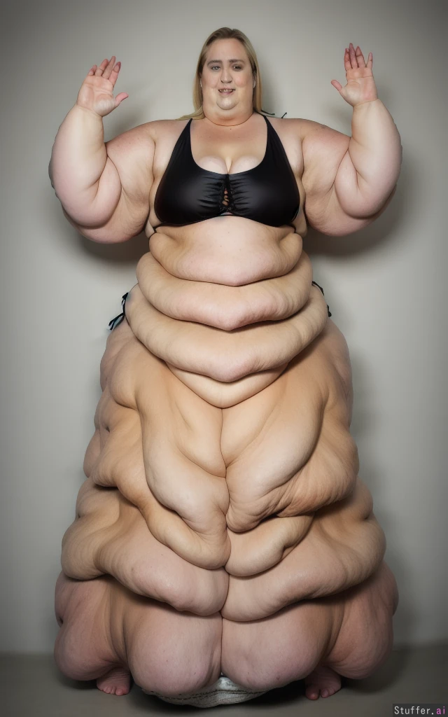 Photo realistic, highly detailed, realistic lighting, blonde ssbbw, standing, beautiful face, (wearing a black bikini:1.4) , (ultra double chin:1.8), (ultra fat face:1.8), ultra huge arms:1.9), (ultra huge legs:1.9), (ultra leg rolls:1.7), (ultra huge calves:1.8), (cellulite:1.5), ultra fat ankles:1.8), bare feet:1.4