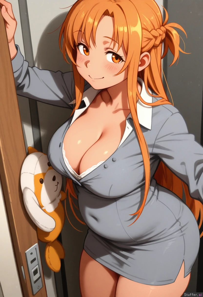 khyle.(artist), asuna_(sao-alo), orange eyes,flirty face, nervous, gray buttoned office dress, covered_belly, belly, thighs, cleavage, curvy,plump,chubby_belly, stuffed_belly, tight_clothing, , side view, top view