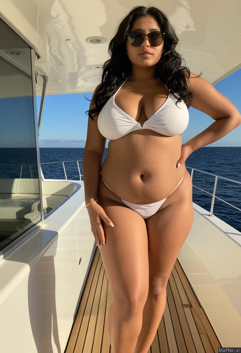 Beautiful tan Indian influencer black wavy hair and an curvy figure, eyeliner, belly crease, pudgy belly, South Indian, curvy, thick, pear shaped, skinny arms, thick legs, thick thighs, wide round butt, thick calves, slender ankles, average boobs, average cleavage, angular jawline, ((dark tanned skin)) ((caramel skin color)) gorgeous, model face, angular jawline, full face of makeup, gold jewelry Lighting: Taken by iPhone, warm lighting ((wide hips)) (((soft creased belly))) Clothing Wearing a white bikini and gold jewelry, sunglasses Setting Yacht deck, she is standing across the deck from viewer, she is looking at viewer