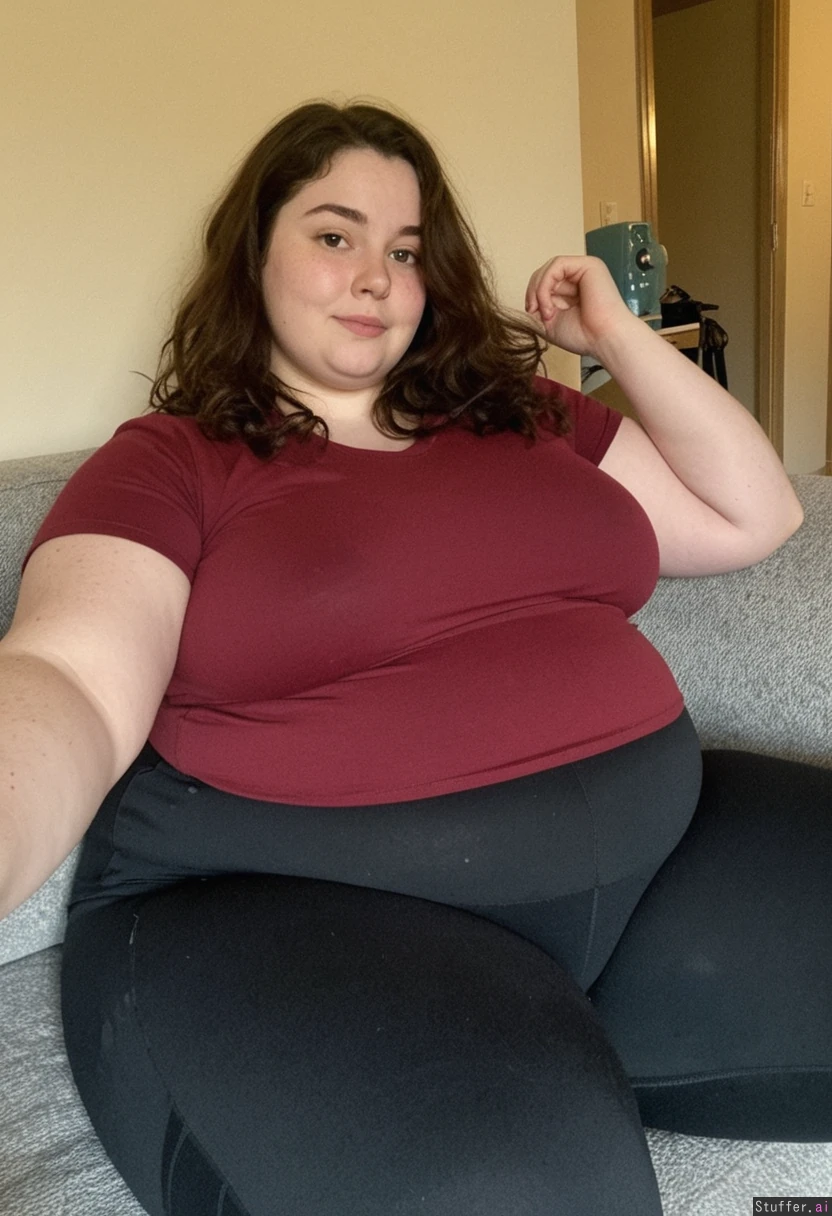 Amateur photography, ((((selfie)))). ((Beautiful)), French woman. (( (fully clothed))), loose dark red top, black cargo pants. sitting on sofa, mid-twenties, wavy dark copper hair, cute soft features, round face, high cheekbones, slight freckles. ((Soft fat curves)), wide hips. shy demeanour. lazy. Hyper massive fat arms Ultra massive fat hips Hyper massive fat blob belly Hyper massive fat legs Face getting fatter inside vivid chaotic french house. bare walls. film grain.