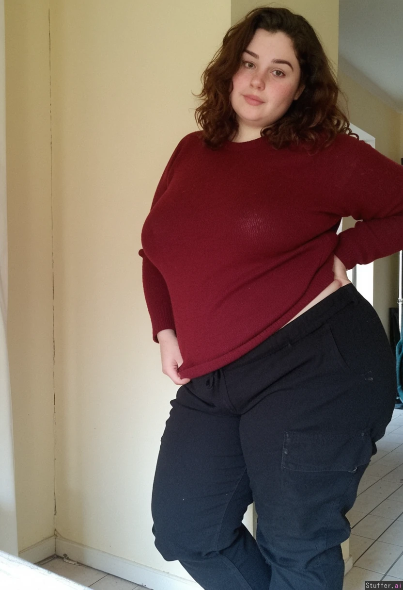 Amateur photography. Candid photo. Beautiful French woman. (((fully clothed))), loose dark red wool jumper, black cargo pants. mid-twenties, wavy dark copper hair, cute soft features, round face, high cheekbones, slight freckles. ((Soft fat curves)), wide hips. shy demeanour. lazy. Hyper massive fat legs Face getting fatter Hyper massive fat blob arms Face getting fatter inside vivid chaotic french house. bare walls. film grain.