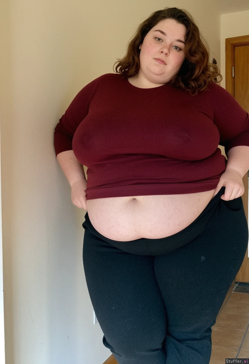 Amateur photography. Candid photo. Beautiful obese fat French woman. (((fully clothed))), loose dark red wool jumper, black cargo pants. mid-twenties, wavy dark copper hair, cute soft features, round face, high cheekbones, slight freckles. ((Soft fat curves)), fat wide hips. shy demeanour. lazy. Hyper massive fat legs Face getting fatter Hyper massive fat round hips Tight clothes Double chin Chubby cheeks Hyper massive fat blob arms Face getting fatter inside vivid chaotic french house. bare walls. film grain.