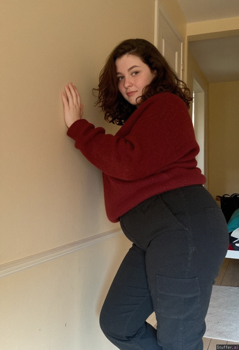 Amateur photography. Candid photo. Beautiful French woman. (((fully clothed))), loose dark red wool jumper, black cargo pants. mid-twenties, wavy dark copper hair, cute soft features, round face, high cheekbones, slight freckles. ((Soft fat curves)), wide hips. shy demeanour. lazy. Face getting fatter inside vivid chaotic french house. bare walls. film grain.