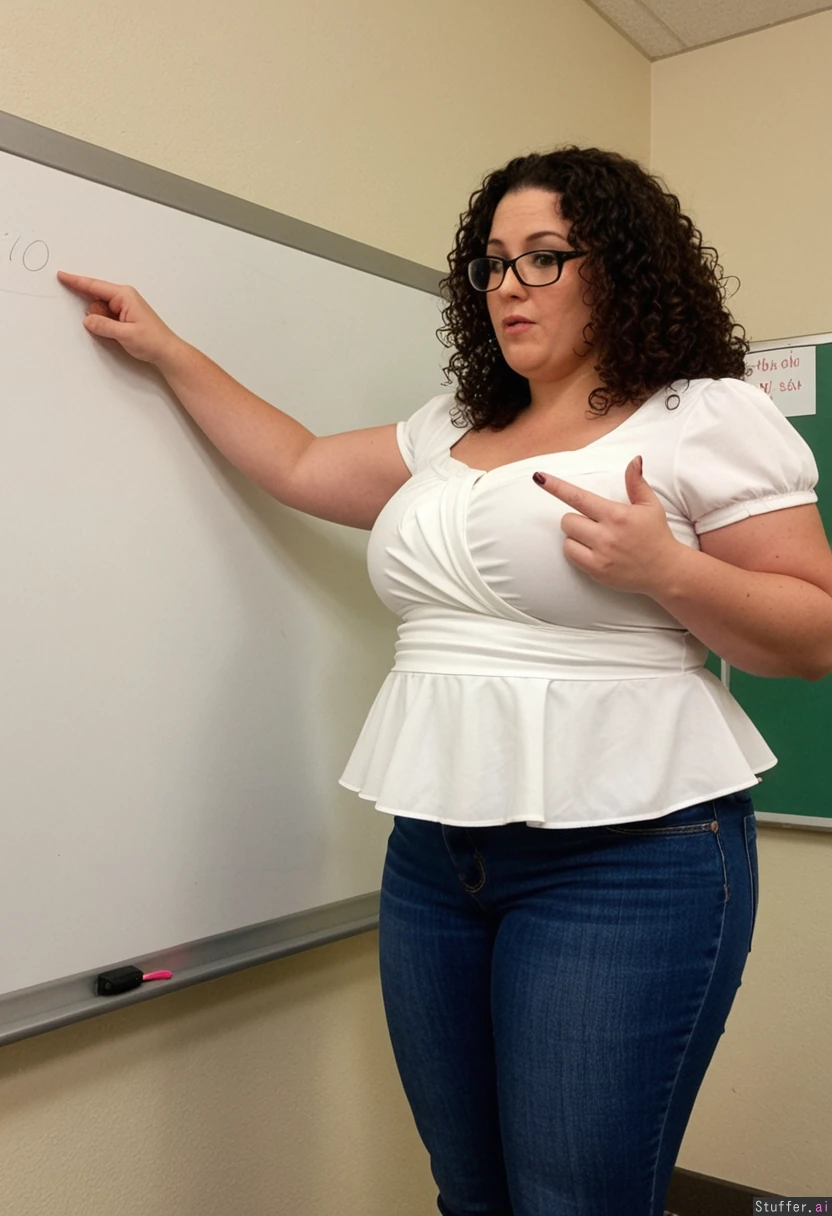 Fat 40 year old socialworker, curly har black framed glasses blue jeans, white peplum top, pointing at white board Face getting fatter