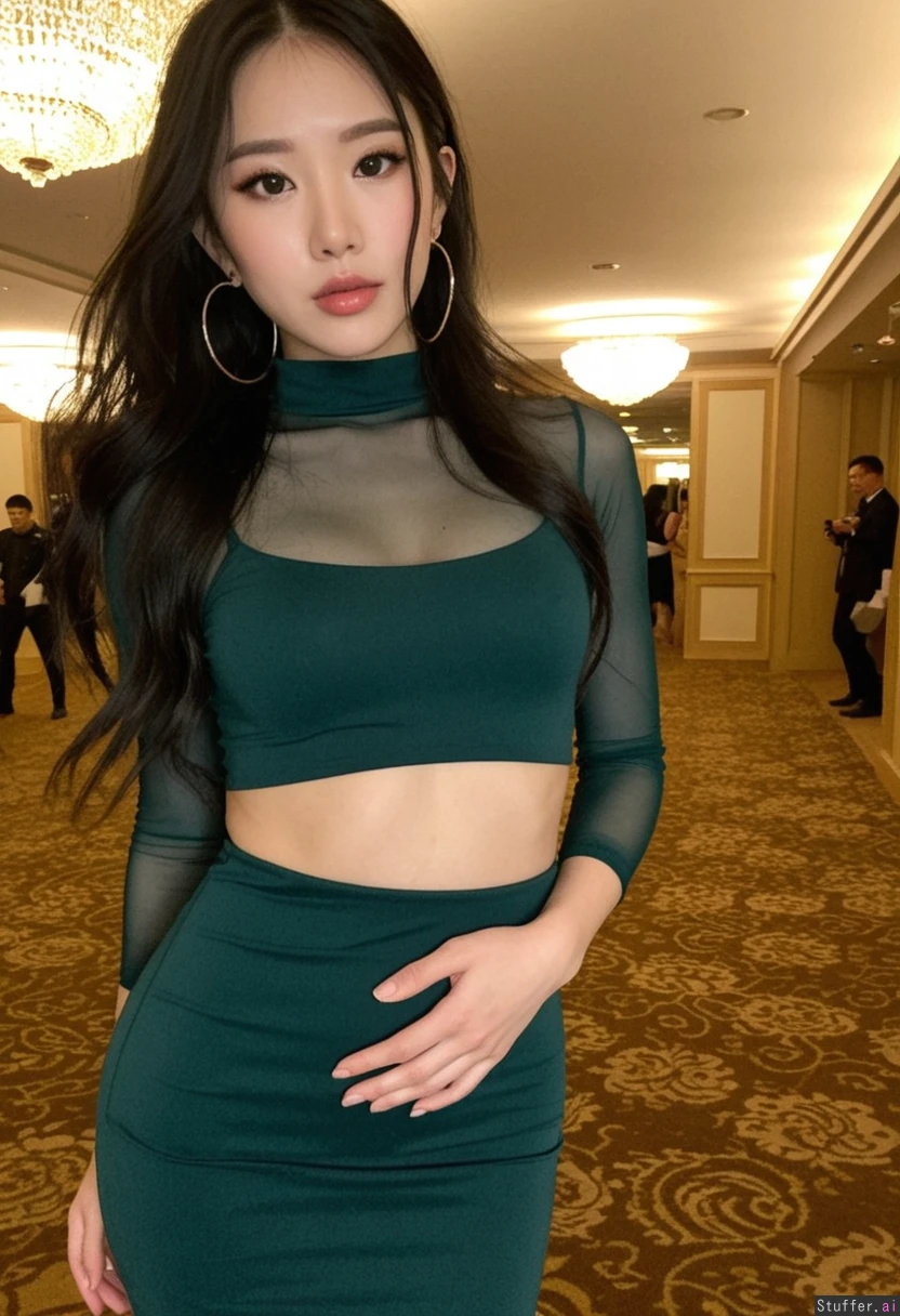 Korean woman with long dark messy hair, eyeliner, wearing dark green skin tight midi dress and hoop earrings at a ballroom (((Slightly soft lower belly)))