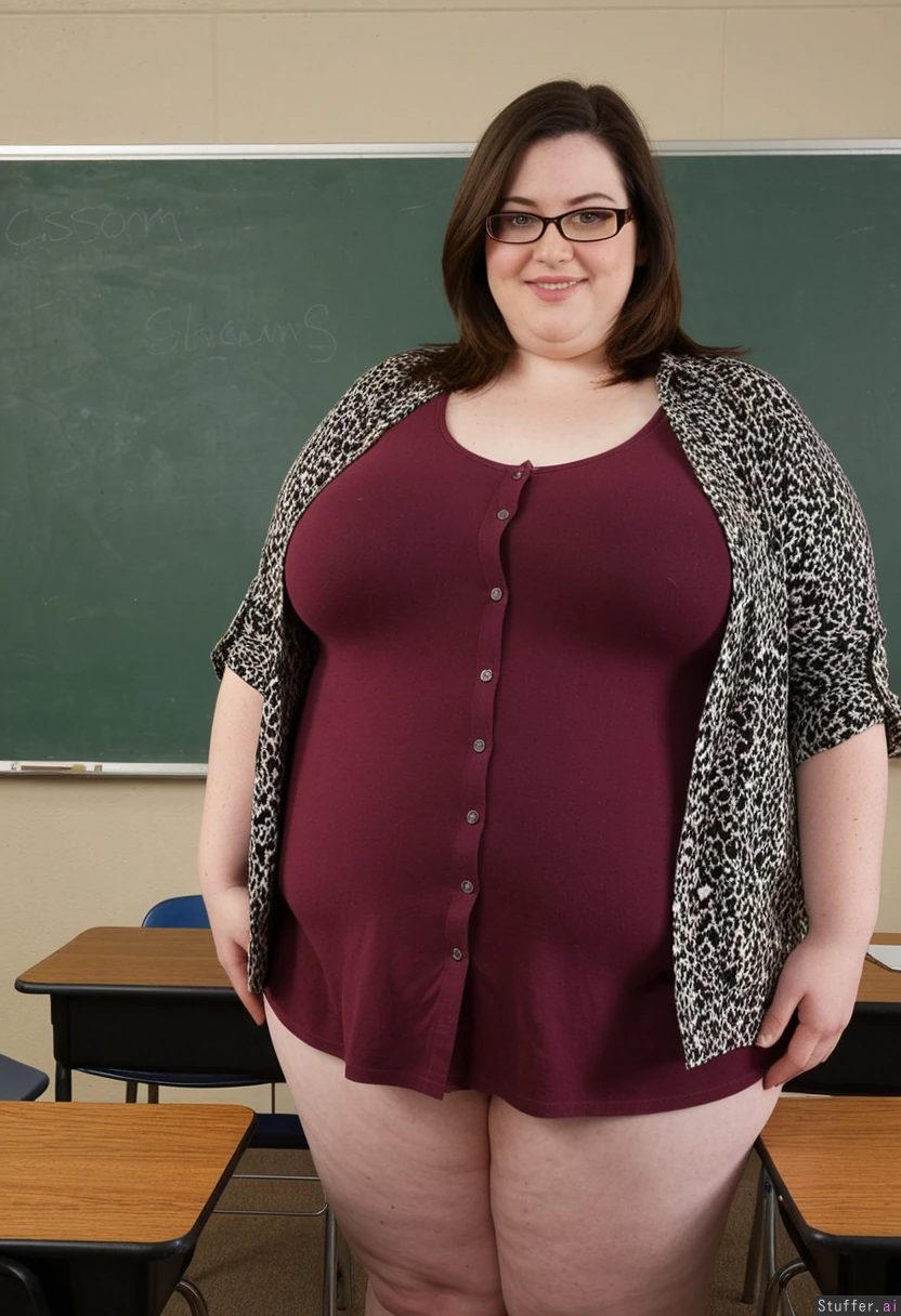(portrait of a middle aged top heavy bbw teacher standing at the top of a classroom:1.3), she wears huge baggy clothes to hide how fat she is, cashmere cardigan, (huge crease-free button up flowy shirt hangs down:1.3), (she has a very pretty face like a fat anne Hathaway:1.2), (long distance view from across the classroom:1.4), empty desks in the foreground, she is shy and doesn't realize how pretty she is, she wears massive clothes to hide her fat body, she gives a shy self conscious smile, (she is a lonely woman:1.0), (she is incredibly pretty but wears unflattering clothes:1.3), thick rimmed glasses, she used to be a model but she really let herself go Face getting fatter Hyper massive fat arms Ultra massive fat legs Hyper massive fat hips