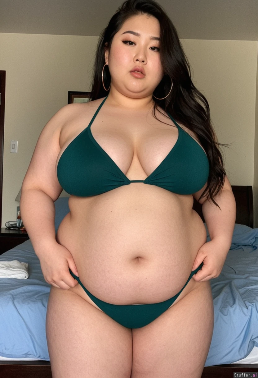 Korean woman with long dark messy hair, eyeliner, wearing dark green skin tight string bikini top and jean shorts and hoop earrings in a bedroom (very thick very fat chubby obese very big lower belly )