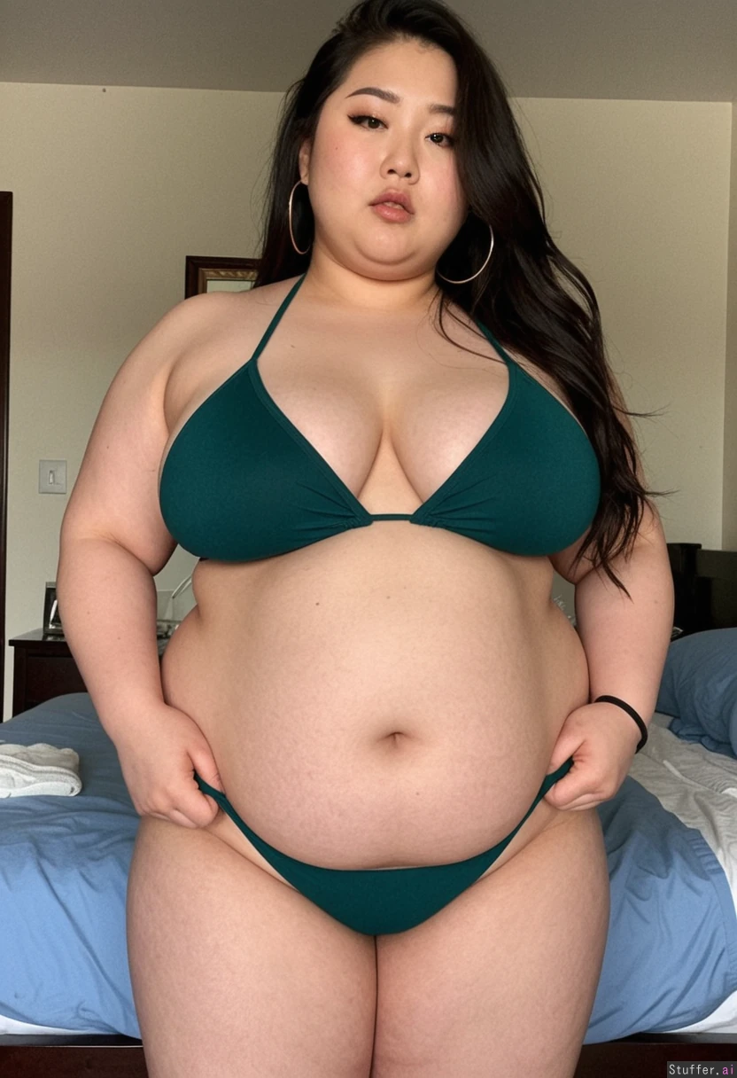 Korean woman with long dark messy hair, eyeliner, wearing dark green skin tight string bikini top and jean shorts and hoop earrings in a bedroom (very thick very fat very chubby obese very big lower belly )