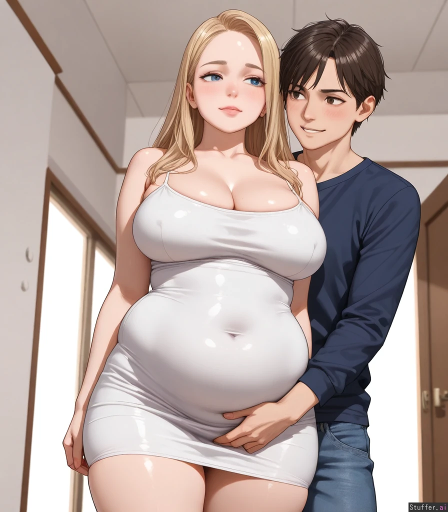 (photorealistic, 1girl and her boyfriend:1.6, apartment, adult, adult, tall, brown_hair, blonde_hair, brown_eyes, blue_eyes, bimbo, tall, european, straight_hair, forehead visible, tight dress, skindentation, slight navel peek, blush, chubby, heterosexual_couple:1.6, teasing for weight_gain:1.6, weight_conscisous:1.6, blushing, smirk, crotch-grab, embarrassed, athletic boyfriend sexually-touching slightly chubby girlfriend:1.4, standing, man standing against woman:1.4, view from front:1.2), (Medium belly:1.4, belly_blush), ((Super-lewd body:1.4, soft super-untoned body:1.4, sexually horny slutty girl:1.4)), ((Super-lewd erotic body:1.4, super-feminine body:1.4)), (realistic-natural breasts:1.4), c.cu\(artist\):1.3), (spellsX\(artist\):1.3), (Kittew\(artist\):1.3), (ohshinakai\(artist\):1.2), (doveymouse\(artist\):1.3), best quality, high rating, ((highest resolution and clarity)), (perfect human anatomy), (high image clarity, sharp image focus), (4k_UHD, highly detailed, highest rating, high resolution, masterpiece quality, realistic expressions, intricate texture detail, dynamic lighting), detailed face, best quality, masterpiece, (pudgy:1.5), (wet and shiny skin, drenched wet), 1woman, gorgeous, beautiful, (adult woman:1.6), (((Super-lewd body:1.4))), (super detailed:1.2, excellent shading:1.3, vibrant coloring:1.3, watercolor:1.3, dynamic lighting:1.4), **base** (best quality), (high rating), absurd res, high res, detailed, ultra quality, ((high quality)), masterpiece, (ultra high resolution), stunning beauty, detailed face, intricate detail, sophisticated detail, exquisite detail, perfect 2D art, realistic lighting, cel shading, correct anatomy, 8k, highly detailed skin texture, 1girl, ((hyperrealistic, photorealistic)), **CWG:** ((pencil sketch style), (rough lines and lineart), (realistic sketch), (detailed sketch), (technical sketch), (detailed sketch style), (excellent dynamic shading), (full color), (intricate detailed textures)). plump thighs, warm light, soft lighting, very flirty expression, ((Slightly chubby belly:1.3, sexual posing:1.3, round belly:1.3, heavy sagging belly:1.3)), ((heavy sagging belly:1.2, super-heavy low-sagging belly:1.2, low belly:1.2)),