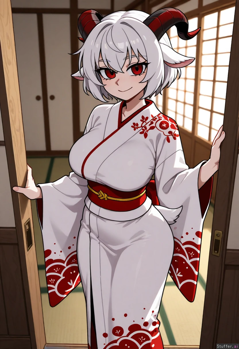 a demi human female with goat eyes goat horns artwork_(digital) big_breasts big_ass thick_ass thick_thighs thick_tail goat tail looking at the viewer smiling at them. white short hair standing on the floor at a tradition japanese house floor looking at the viewer infornt of them wearing a white kimono with red patterns beautifully printed hd, high quality, masterpiece, high res, 1girl, solo, vanripper (artist) flat artwork_(digital) front angle standing straight looking_at_viewer