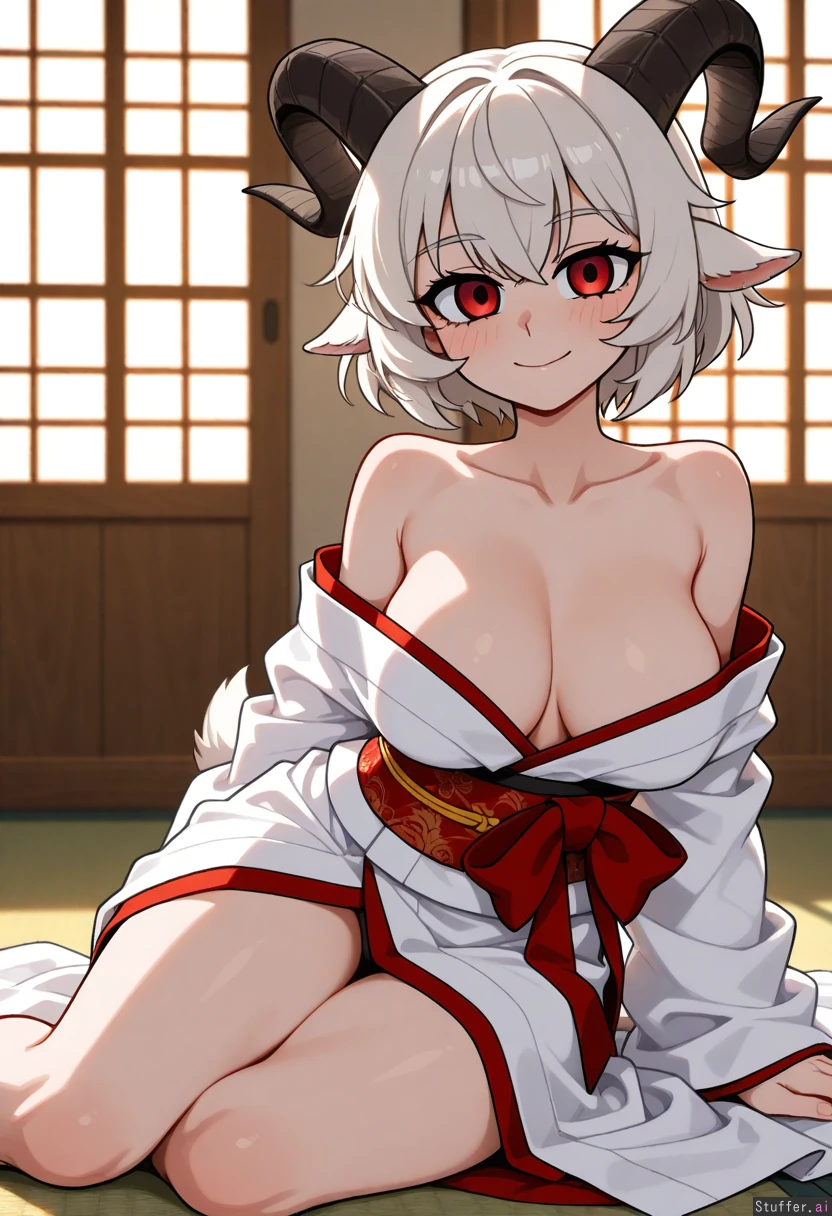 a demi human female with goat eyes goat horns artwork_(digital) big_breasts big_ass thick_ass thick_thighs thick_tail goat tail looking at the viewer smiling at them. white short hair sitting on the floor at a tradition japanese house floor looking at the viewer infornt of them wearing a white kimono with red patterns beautifully printed hd, high quality, masterpiece, high res, 1girl, solo, vanripper (artist) flat artwork_(digital) front angle standing straight looking_at_viewer red eyes